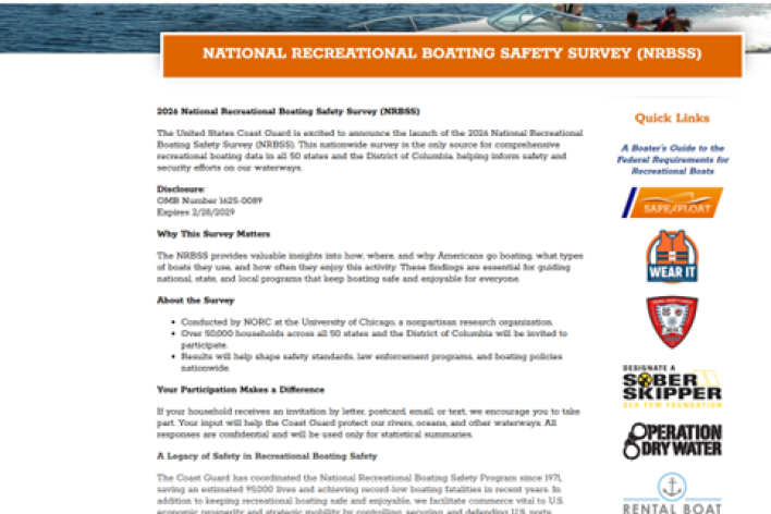 The United States Coast Guard is excited to announce the launch of the 2026 National Recreational Boating Safety Survey (NRBSS). This nationwide survey is the only source for comprehensive recreational boating data in all 50 states and the District of Columbia, helping inform safety and security efforts on our waterways.