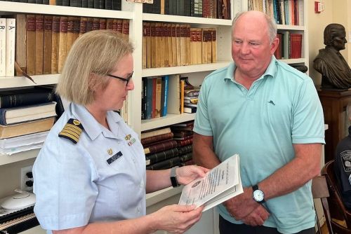 06/20/2024 – Mariners House, Boston, MA: Captain Bob Blair. President of the MBHSC, being recognized by CAPT Kailie Benson, USCG Sector Boston Commander as an “Honorary Member” of the USCG Sector Boston Crew!  - BZ Captain Blair!